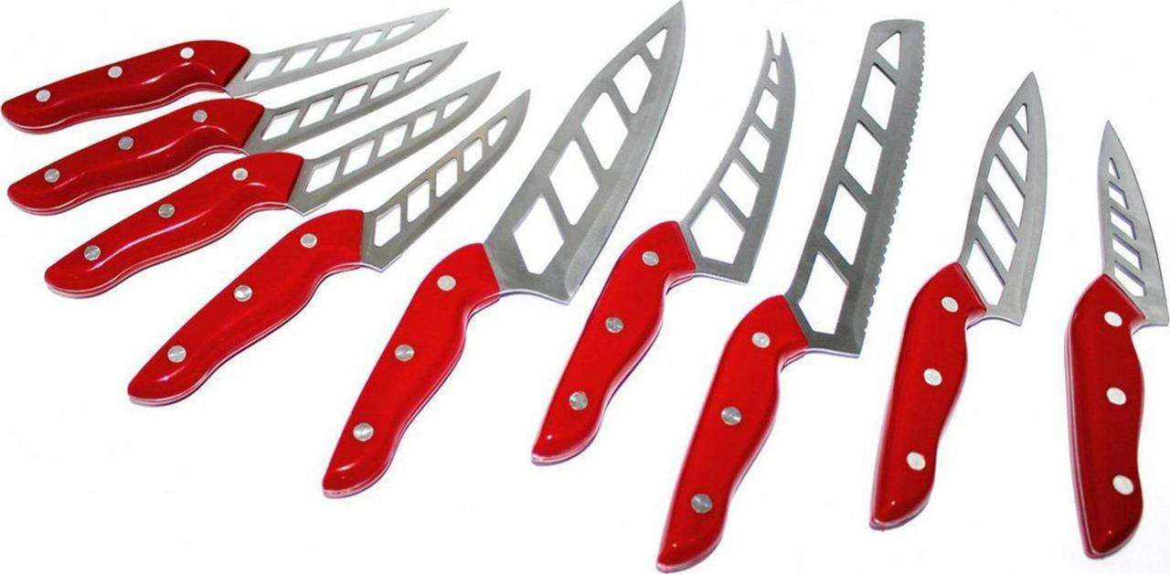 Забудьте про ножи, к которым прилипает нарезаемый продукт! Набор аэроножей – это уникальные облегченные ножи, выполненные из высококлассной нержавеющей стали. Вы будете в восторге от набора, включающего в себя девять удивительных ножей. Преимущества: • Прочная нержавеющая сталь • Форма лезвий предотвращает прилипание разрезаемых продуктов к ножу • Удобные эргономичные рукоятки • Острые лезвия не требуют заточки • Облегченная конструкция в сочетании с великолепной балансировкой • Яркий и стильный дизайн • Долговечная и надежная конструкция